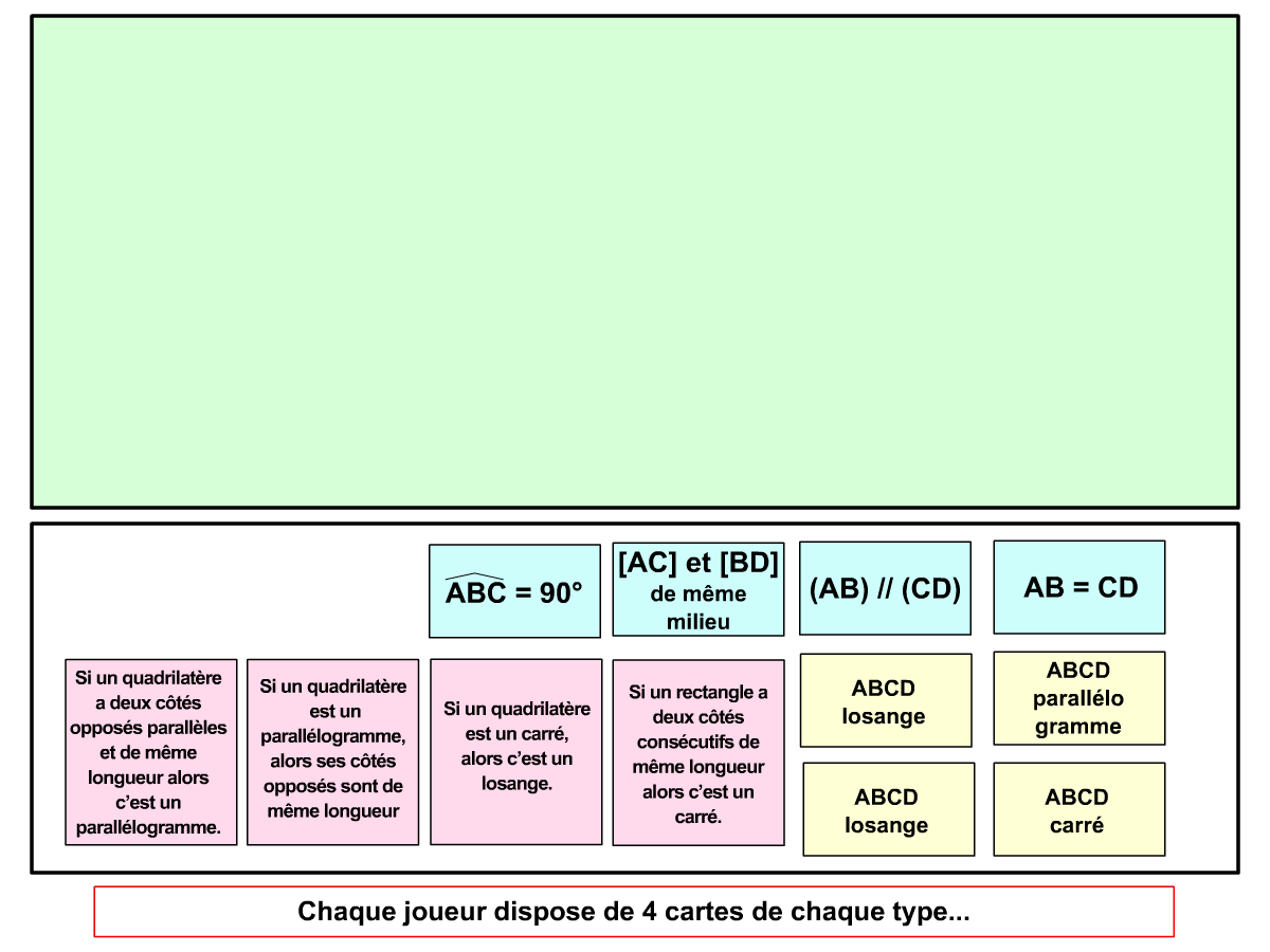 2) Vous marquez sur la règle 96 cartes avec 32 quadrilatères, 30 particularités et 28 propriétés. Or 32+30+28=90 et non 96. A quoi correspondent les 6 autres cartes ?